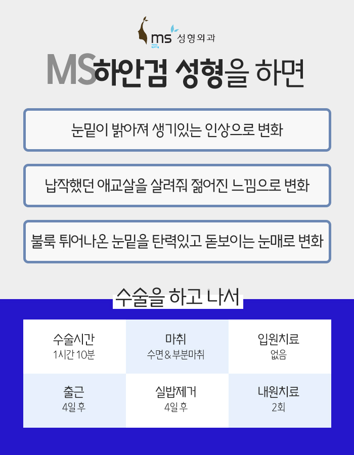 그래서 수술 후에는 눈빛이 밝아지면서 인상이 생기 있어 보이게 되고 납작했던 애교살을 살려주는 것을 통해 젊어진 느낌으로 변화시키는데 도움을 받아보실 수 있습니다. 또한 불룩 튀어나온 눈밑을 탄력 있고 돋보이는 눈매로 변화시키는 데도 도움을 받아보실 수 있는데요.