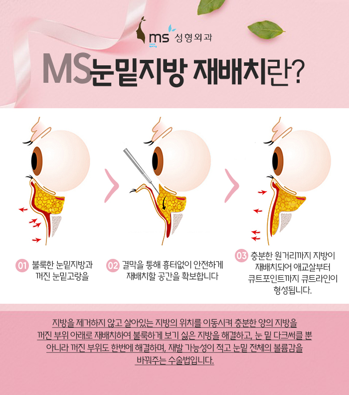 요즘 눈밑지방 재배치를 받으시는 분들이 많습니다. 하지만 이러한 눈밑지방 재배치도 어떤 방법으로 어떻게 하느냐에 따라서 결과적인 면에 많은 차이가 발생하기 때문에 분당눈밑지방재배치 잘하는곳을 찾는 것이 무척 중요한데요. 그래서 오늘 분당눈밑지방재배치 잘하는곳 분당 ms성형외과에서는 이러한 수술 방법에 대해 이야기하려 합니다.