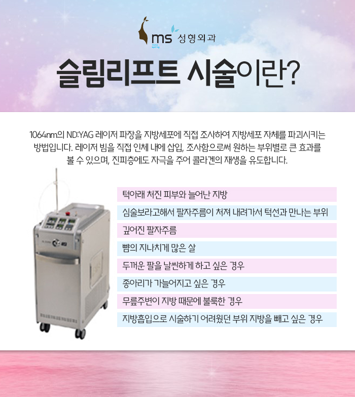 그리고 슬림리프트 시술이 있는데요. 1064nm의 엔디야그 레이저 파장을 지방세포에 직접 조사해서 지방세포 자체를 파괴시키는 방법을 말합니다. 레이저 빔을 직접 인체 내에 삽입하고 조사하는 것을 통해 원하는 부위별로 크게 효과를 볼 수 있도록 도와주는데요. 진피층에도 자극을 주는 만큼 콜라겐 재생을 유도한답니다.