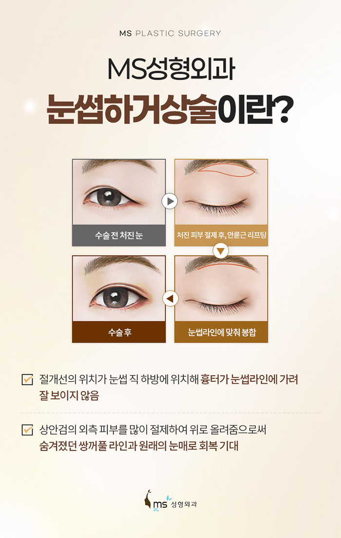 용인수원이마눈썹거상술은 상안검 외측의 피부를 많이 절제해서 위로 올려주는 것을 통해 숨겨져 있던 쌍꺼풀 라인과 원래의 눈매를 회복하는데 도움을 주는 수술을 말합니다. 절개선의 위치가 눈썹 직하방에 위치하고 있어서 흉터가 눈썹 라인에 가려져 잘 보이지 않는데요. 원래의 눈매가 보존가지가 높은 경우에, 또 눈과 눈썹 사이의 거리가 가까워서 상안검수술로 쌍꺼풀을 만들 경우 인상이 강해보이는 등의 문제가 발생할 것이 예상될 때 적합한 수술입니다.