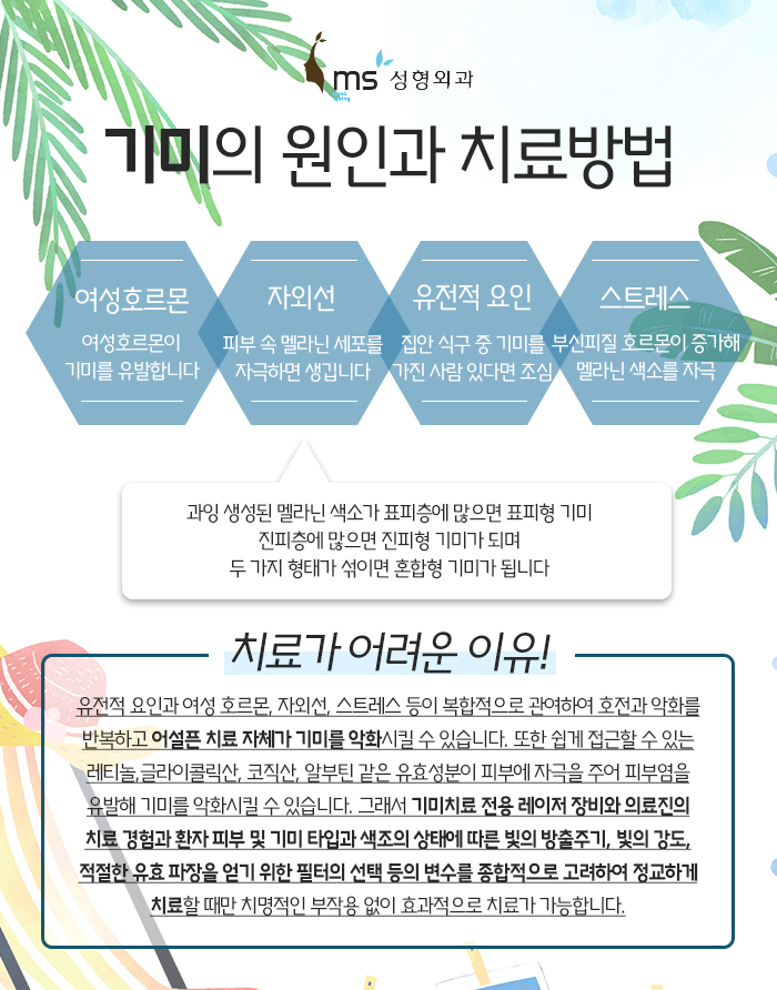 그렇기에 기미치료 전용 레이저 장비와 의료진의 경험, 환자의 피부 및 기미타입과 색조의 상태에 따른 빛의 방출주기, 빛의 강도, 적절한 유효 파장을 얻기 위한 필터의 선택 등 다양한 변수를 고려해서 정교하게 시술을 진행해야 한답니다.