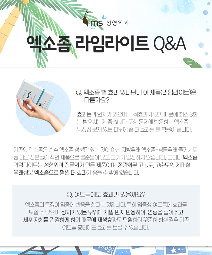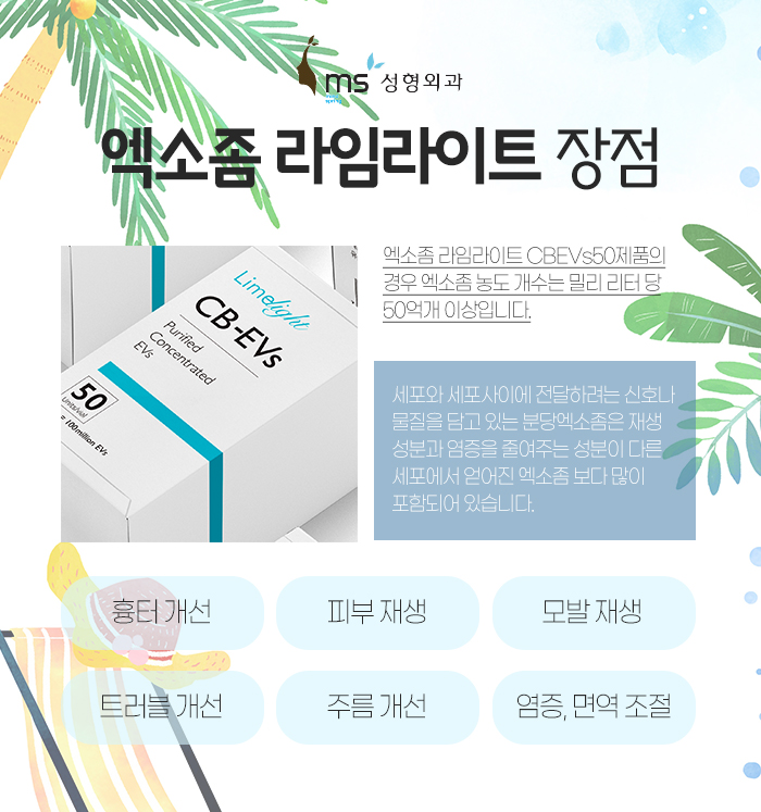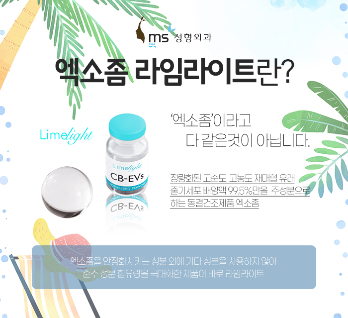 그리고 분당 ms성형외과에서는 판교피부관리 엑소좀으로 라임라이트를 사용하고 있는데요. 이러한 엑소좀 라임라이트는 정량화된 고순도, 고농도 제대혈 유래 줄기세포 배양액의 99.5%만을 주성분으로 하고 있답니다. 나머지 0.5%는 엑소좀을 안정화시키는 성분으로만 이루어져 있고, 기타 성분은 없는데요. 그래서 순수 성분 함유량을 극대화시킨 제품이라고 할 수 있습니다.