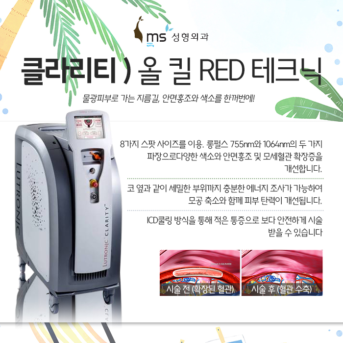 참고로 클라리티 레이저에 대해서도 잠깐 이야기를 해보자면 여러 색소와 안면홍조, 모세혈관 확장증을 개선하는데 도움을 주는 레이저 기기를 말하는데요. 부드럽고 안전한 색소 블리칭 효과로 인해 작은 색소 병변도 놓치지 않은 기술로 멜라닌 색소를 파괴하고 감소시키는데 도움을 줍니다. 또 부드럽고 편안한 콰트로 테크닉으로 모공이나 주름을 개선하고 싶거나 울긋불긋한 홍조 및 색소침착이 재발한 경우에도 도움을 준답니다. 그래서 엑소좀과 함께 찾으시는 분들이 많습니다.