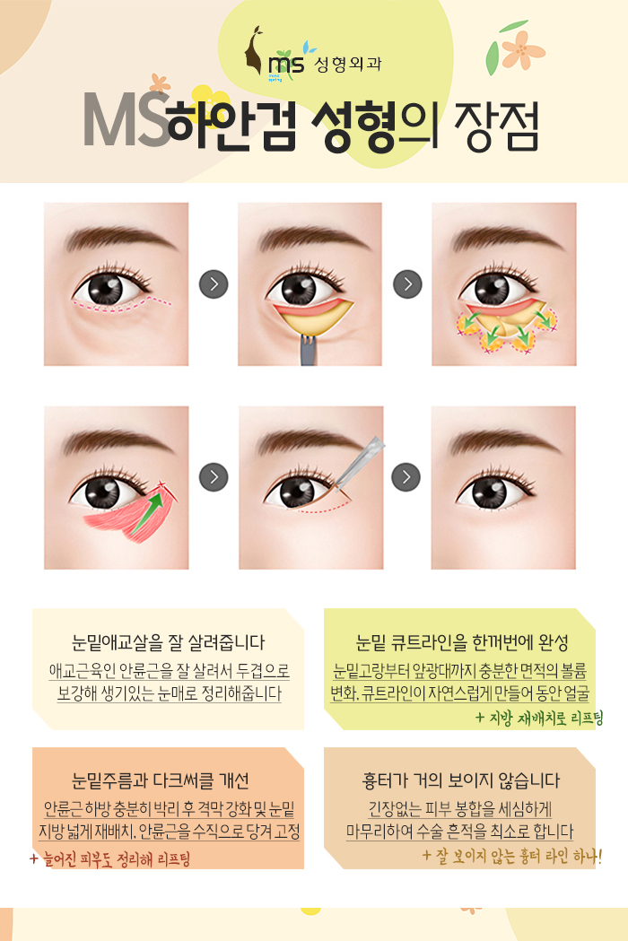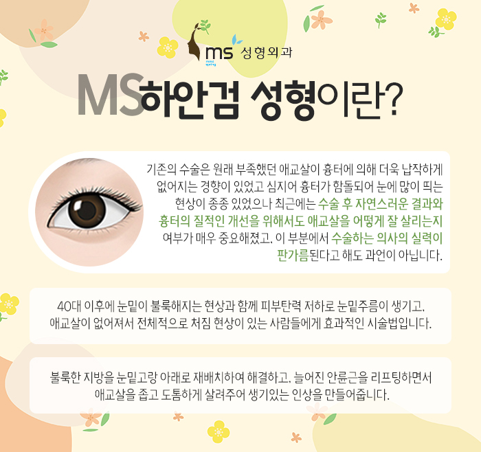 이렇게 하안검성형을 하고 나서 자연스러우려면, 또 흉터의 질적을 개선을 위한다면 애교살을 어떻게 잘 살리는 지가 무엇보다 중요하답니다. 그리고 이는 수술을 하는 의료진의 실력에 따라 판가름이 나기 때문에 하안검성형 ms성형외과를 찾으시는 분들이 많은데요.