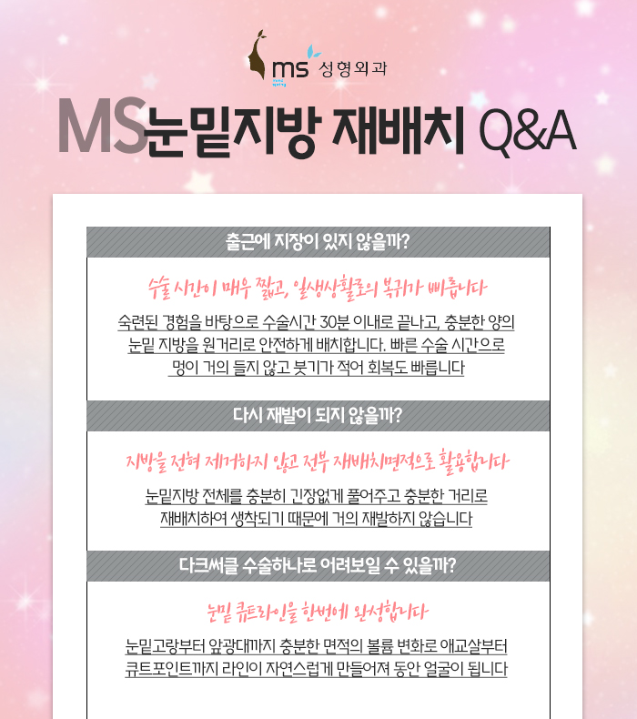 어느 순간부터 눈밑에 선명하게 다크써클이 자리 잡아서 한 숨을 쉬고 계신 분들이 많습니다. 또 이렇게 다크써클이 생기게 되면 눈밑지방이 불거져 나오거나 애교살이 조금씩 사라지기 시작하는 등의 증상이 나타나서 고민하시는 분들이 많은데요. 그래서 오늘 분당 ms성형외과에서는 성남눈밑지방재배치에 대해 다루어보도록 하겠습니다.