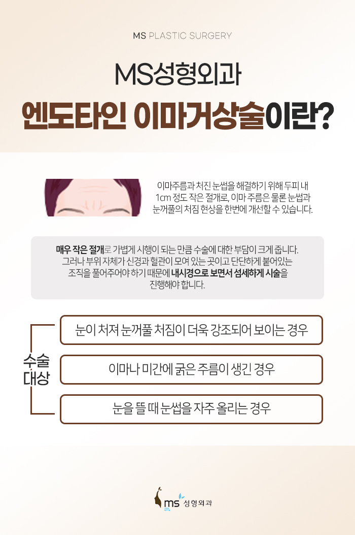 이러한 엔도타인 이마거상술은 눈이 처지면서 눈꺼풀의 처짐이 더욱 강조되어 보이거나 이마나 미간에 굵은 주름이 생긴 경우, 눈을 뜰 때 눈썹을 자주 올리는 경우에 받기 적합하답니다.