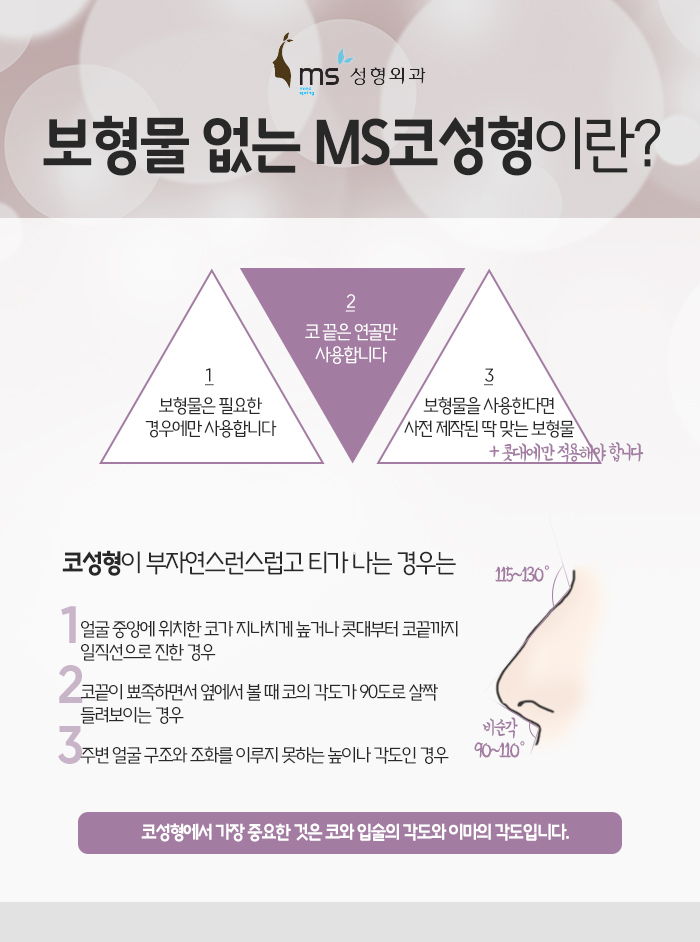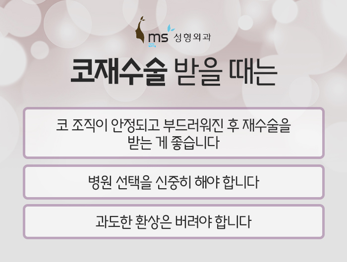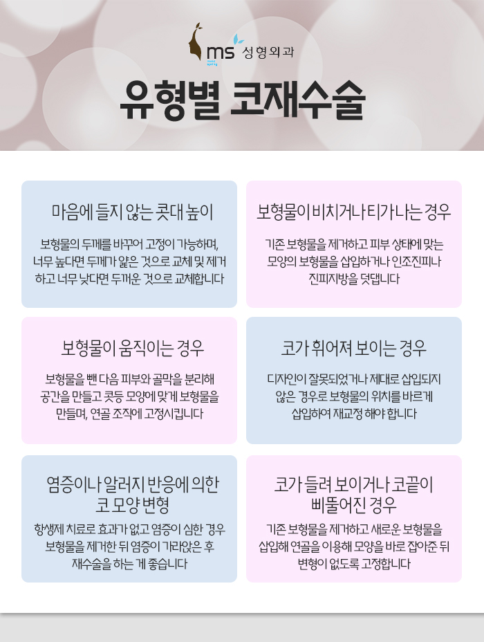 덧붙여 코재수술을을 받고자 하는 경우에는 이 외에도 콧대의 높이가 마음에 들지 않거나 보형물이 비치거나 티가 나서, 보형물이 움직여서, 코가 휘어져 보여서, 코가 들려 보이거나 코끝이 삐뚤어져서가 있습니다.