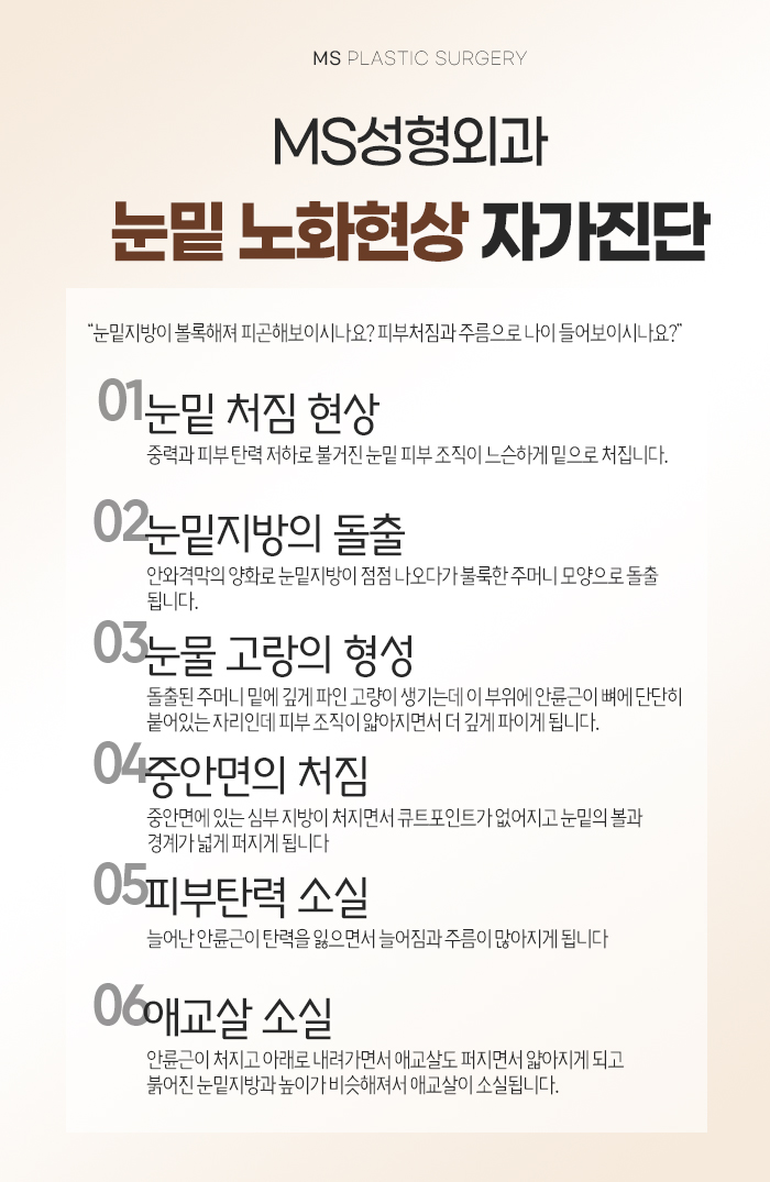 이렇게 돌출된 주머니 밑에 고랑이 깊게 파이게 되는데, 이 부위에 안륜근이 뼈에 단단히 붙어 있는 만큼 피부 조직이 얇아지게 되면서 더욱 깊게 파이게 된답니다. 그리고 중안면에 있는 심부지방이 처지게 되면서 큐트 포인트가 없어지게 되고, 눈밑의 볼과 경계가 넓게 퍼지게 되는데요. 이렇게 늘어난 안륜근이 탄력을 잃으면서 늘어짐과 주름이 많아지게 된답니다. 또 안륜근이 처지고 아래로 내려가게 되면서 애교살도 퍼지며 얇아지게 되고, 불거져 나온 눈밑지방과 높이가 비슷해지면서 애교살이 소실되고 맙니다.