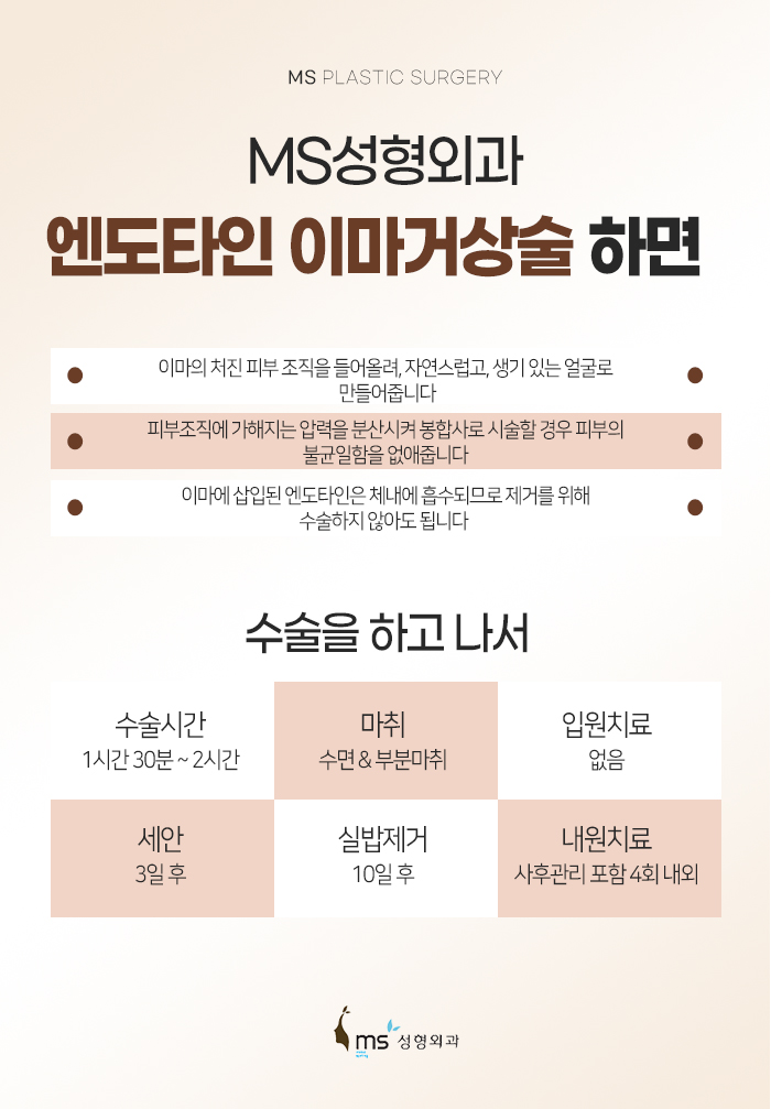 또 엔도타인 이마거상술을 통해서도 도움을 받아보실 수 있는데요. 눈이 처지면서 눈꺼풀 처짐이 더욱 강조되어 보이거나 이마나 미간에 굵은 주름이 생긴 경우, 눈을 뜰 때 눈썹을 자주 올리는 경우에 적합한 수술이랍니다.
