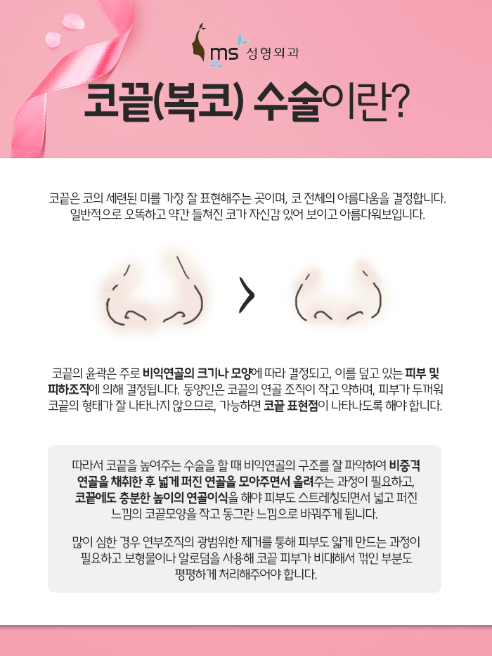 자연스러우면서 예쁜 코를 갖기 위해 성남성형외과의원을 찾으시는 분들이 많습니다. 그래서 오늘 분당 ms성형외과에서는 이러한 코수술에 대해 이야기하려고 하는데요. 현재 코 수술을 받으려 하는데 자신의 경우에는 어떻게 수술을 진행하는 것이 적합한지 알아보고 있다면, 또 코재수술을 받아야 하는 상황인데 잘 알려진 곳에서 상담 및 진단을 받고자 하신다면 성남성형외과의원 분당 ms성형외과를 찾아주시기 바라겠습니다.
