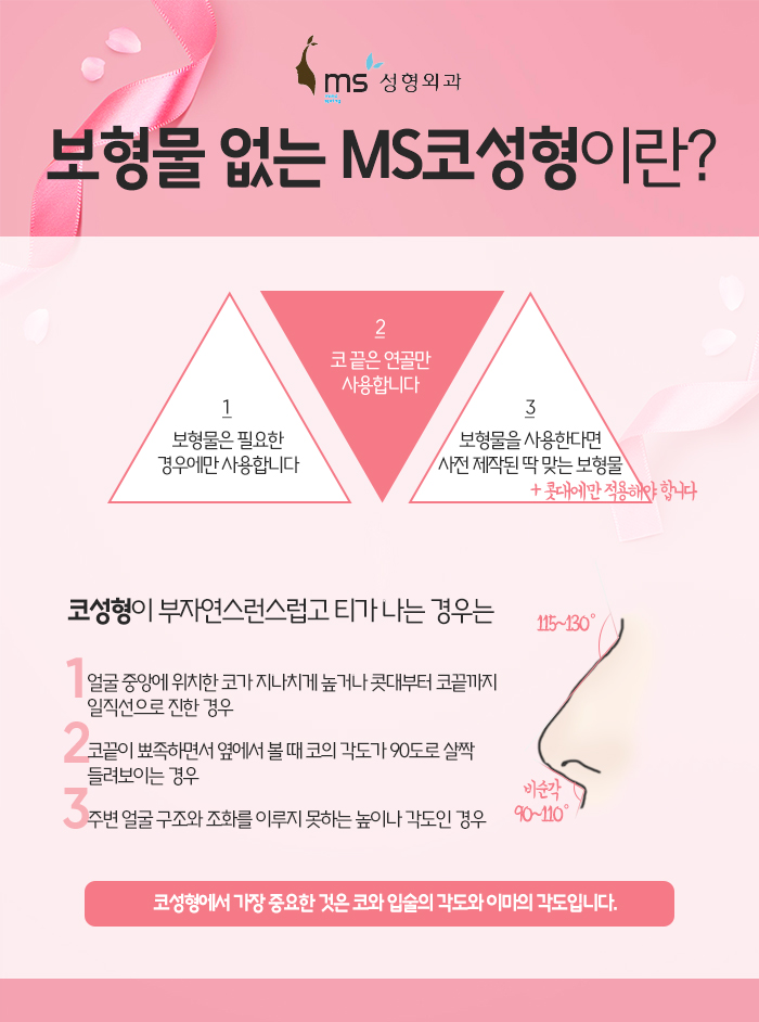 그리고 이렇게 코수술을 진행할 때 중요한 것은 원하는 예쁜 코 모양을 만드는 것도 중요하지만 그 코가 주변 얼굴과 잘 어울리냐 하는 것입니다. 아무리 코가 예뻐도 주변 얼굴과 잘 어울리지 못한다면 결국 수술한 티가 많이 나게 되기 때문인데요. 그래서 성남성형외과의원 분당 ms성형외과에서는 코와 입술의 각도, 코와 이마의 각도 등을 고려해서 코 수술을 진행하고 있답니다.