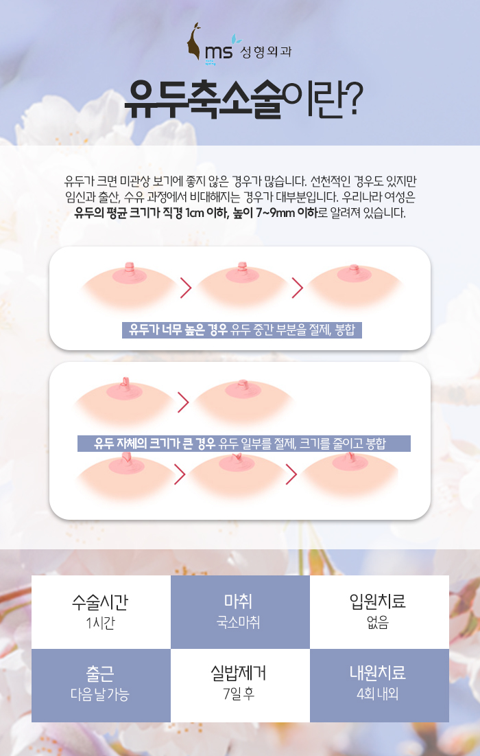 유두가 너무 높은 경우에는 유두 중간 부분의 피부를 절제하고 봉합하는 것을 통해 도움을 받아보실 수 있으며, 유두 자체의 크기가 큰 경우에는 유두의 일부를 절제해서 크기를 줄이고 봉합하는 것을 통해 도움을 받아보실 수 있습니다.