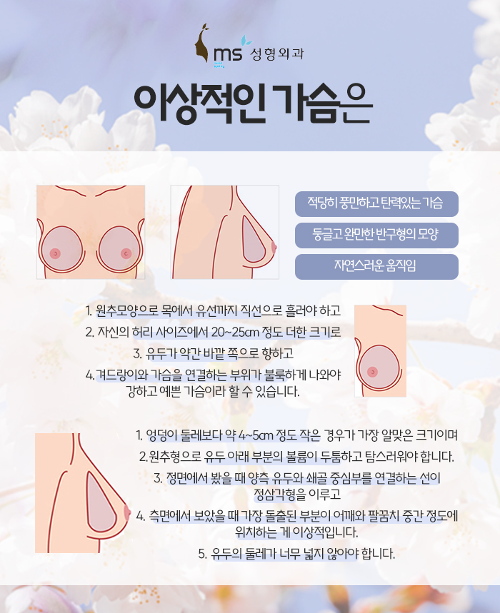 또 분당 ms성형외과에서는 동탄가슴성형 함몰유두 수술을 포함해서 여성 가슴 수술을 하게 될 때 이상적인 가슴 모양을 갖으실 수 있도록 진행하고 있답니다. 참고로 이상적인 가슴은 적당히 풍만하고 탄력이 있으면서 둥글고 완만한 방구형의 모양에 그 움직임이 자연스러운 것입니다.
