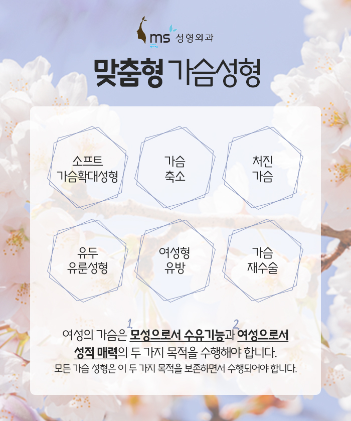 그리고 동탄가슴성형 함몰유두 수술은 유두 유륜 성형에 해당되는데요. 이 외에도 소프트 가슴 확대 수술, 가슴 축소 수술, 처진 가슴 수술, 가슴 재수술이 있는 분당 ms성형외과입니다. 이렇게 여성 가슴 수술을 진행하게 될 때는 모성으로서의 수유 기능과 여성으로서의 매력 두 가지 목적을 수행할 수 있도록 진행해야 하는데요. 분당 ms성형외과에서는 이러한 목적을 수행할 수 있도록 동탄가슴성형 함몰유두 수술을 진행하고 있답니다.