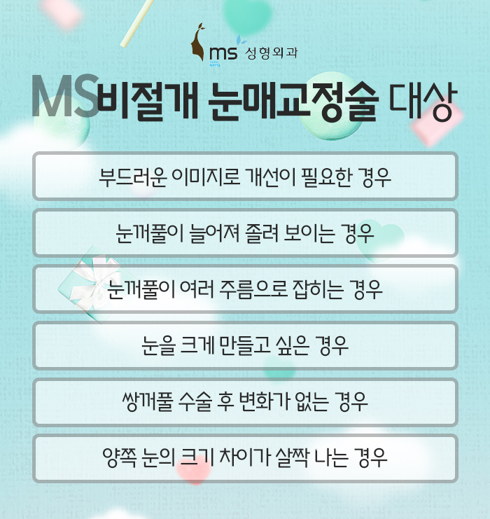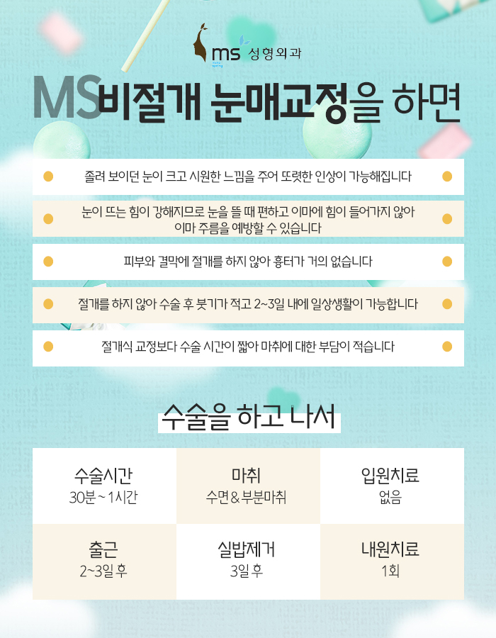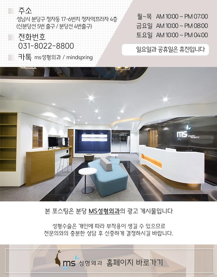 또 분당 ms성형외과에서 비절개 눈매교정을 받게 되면 쌍수매몰풀림 등의 문제에 대해 걱정하지 않아도 될뿐더러 졸려 보이던 눈이 크고 시원한 느낌을 주게 되면서 인상이 또렷해지는 것이 가능해집니다. 그리고 눈을 뜨는 힘이 강해지는 만큼 눈을 뜰 때 편하며, 이마에 힘이 들어가지 않아서 이마에 생기는 주름을 예방하는데 도움을 받아 보실 수 있는데요.