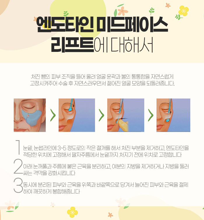이렇게 엔도타인 미드페이스 리프트를 진행하게 되면 눈밑과 눈썹 라인에 3~5 정도로 작게 절개하여 처진 부분을 제거하고 엔도타인을 적당한 위치에 고정시킵니다. 그래서 팔자 주름에서 눈밑까지 처지기 전의 위치로 고정하게 되는데요. 아래 눈꺼풀과 주름에 붙은 근육을 분리하며 여분의 지방을 제거하거나 지방을 둘러싸는 격막을 강화시킨답니다. 또 분리된 피부와 근육을 위쪽과 바깥쪽으로 당겨서 늘어진 피부와 근육을 절제하여 깨끗하게 봉합시켜 주는데요.