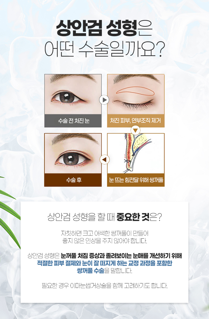 이렇게 상안검 수술을 진행할 때 중요한 것은 자칫하면 크고 어색한 쌍꺼풀이 만들어지면서 좋지 않은 인상을 주지 않도록 하는 것입니다. 이를테면 눈썹 처짐이 심하거나 눈과 눈썹 사이의 거리가 가까운 경우 수술 후 어색해보일 수 있는데 이런 경우에는 눈썹하거상술이나 분당이마거상 동안성형을 진행하시는 게 좋습니다.