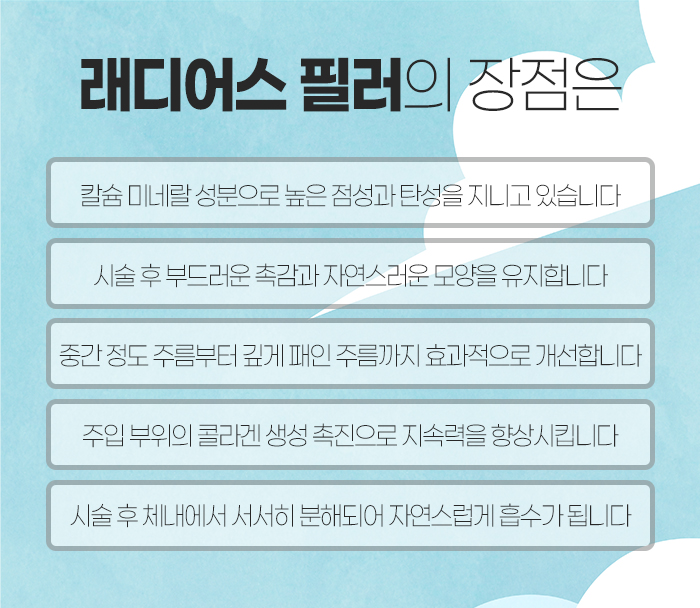 이 중 칼슘 필러인 래디어스 필러에 대해 얘기하자면 체내에서 분해속도가 가장 느린 칼슘 성분으로 이루어져 있기 때문에 점성이 뛰어나며 퍼짐이 없답니다. 또 유지기간이 길고 미간과 콧대, 팔자, 턱끝에 시술 받기 적합한데요.