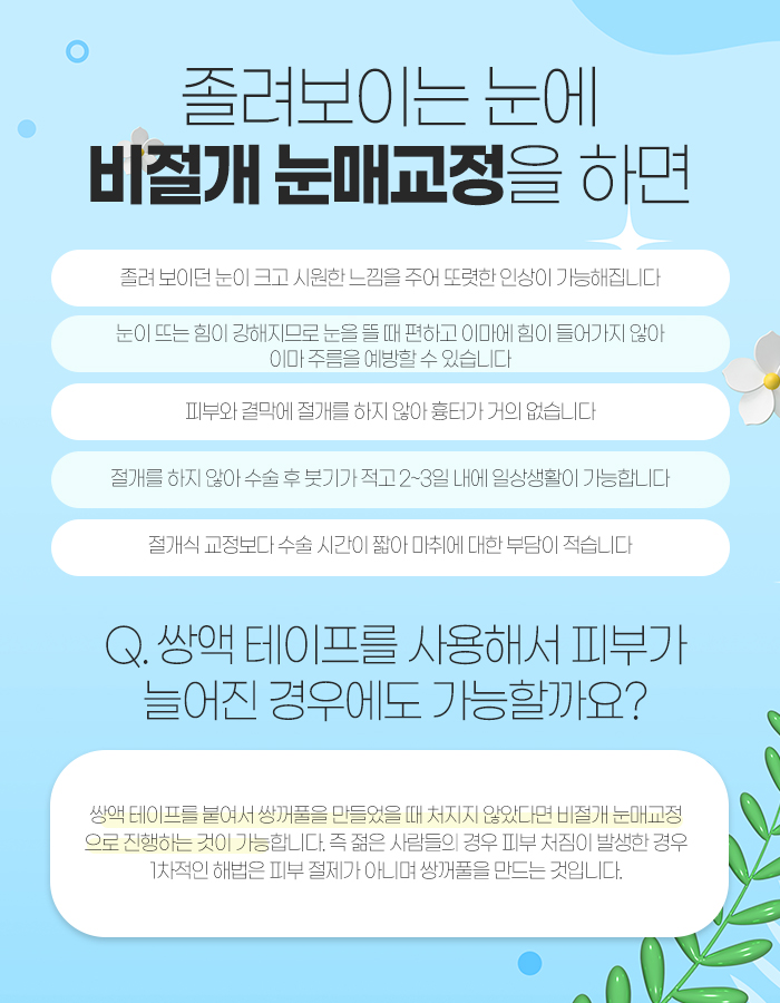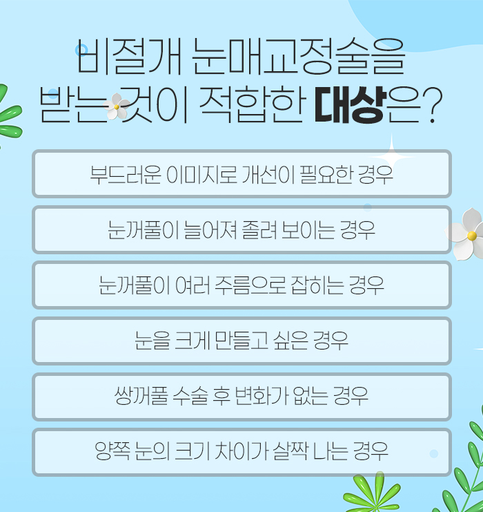 특히 비절개 방식으로 진행하게 되면 안구 돌출이 심한 사람의 경우, 졸려 보일 때 부작용 없이 교정하고자 할 때, 쌍꺼풀이 예쁘게 있지만 졸려 보이는 눈만 교정하고자 할 때, 피부가 두꺼워 이미 절개법을 시행했는데 쌍꺼풀 라인이 흐릿할 때 도움을 받을 수 있습니다.
