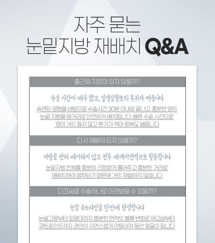 덧붙여 이렇게 수술을 받고 나서 제대로 눈밑지방이 개선되지 않거나 다크써클이 다시 재발하는 경우 등이 있는 만큼 분당눈밑지방재배치를 진행해도 어떤 방법으로 하는 것이 좋은지에 대해서 말씀드리는 시간도 가지도록 하겠습니다.