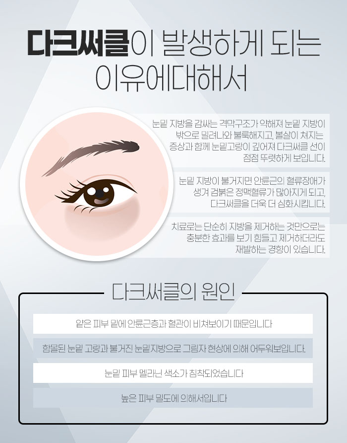 또 얕은 피부 밑에 안륜근층과 혈관이 비쳐 보이거나 함몰된 눈밑고랑과 불거진 눈밑지방으로 인해 그림자 현상에 의해 어두워 보여서, 눈밑 피부 멜라닌 색소가 침착되어서, 높은 피부 밀도에 의해서 발생하게 되는데요. 이런 경우 단순히 눈밑지방을 제거하는 것만으로는 충분히 효과를 보기 힘들답니다. 또 제거를 한다고 하더라도 다시 재발하는 경향이 있습니다.