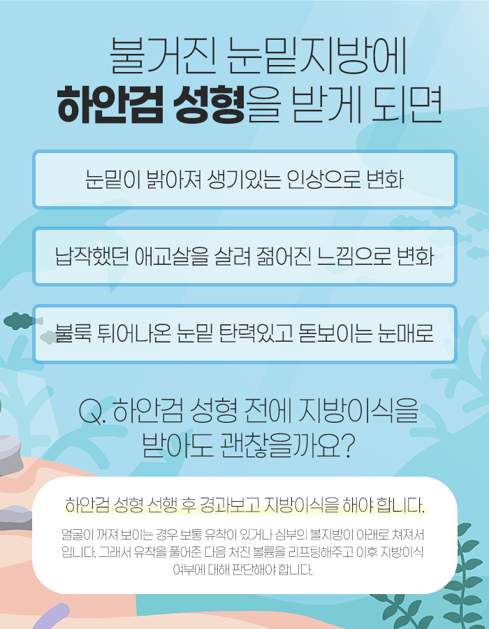 그리고 지방이식에 대해서도 고려하시는 분들이 많은데 이는 하안검수술을 먼저 진행하고 나서 고려하시는 게 좋습니다. 그 이유는 유착된 조직을 풀어주어야 하는데 지방이식을 먼저 진행하게 되면 유착된 조직을 풀어주기 어렵기 때문입니다. 그래서 좋은 결과를 기대할 수 없습니다. 반면 하안검수술을 먼저 진행하고 나서 경과를 지켜보고 소량으로 진행하게 되면 보다 자연스러운 결과를 기대하실 수 있답니다.