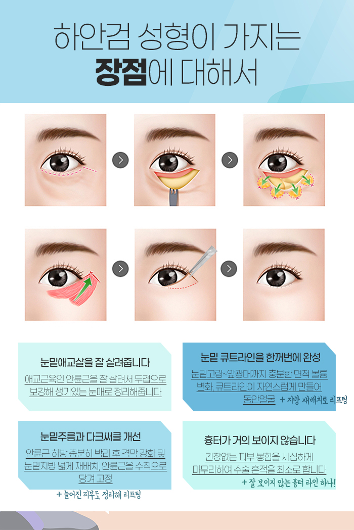 이로 인해 눈밑이 밝아지면서 인상이 생기 있어 보이고 납작했던 애교살을 살려주는 것을 통해 젊어진 느낌으로 변하는데 도움을 받아보실 수 있습니다. 또 불룩 튀어나온 눈밑을 탄력 있고 돋보이는 눈매로 변화시키는 데도 도움을 받아보실 수 있는데요.