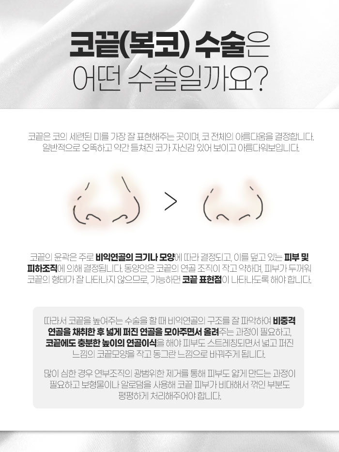 그리고 코끝 수술에 대해 말해보자면 우리나라 사람의 경우 콧볼의 연골을 모으는 것만으로는 충분한 코 높이를 얻지 못하는 경우가 많답니다. 그렇기에 코끝 연골이식으로 코끝의 높이를 더 높여주는 수술을 하는 것이 필요한데요.