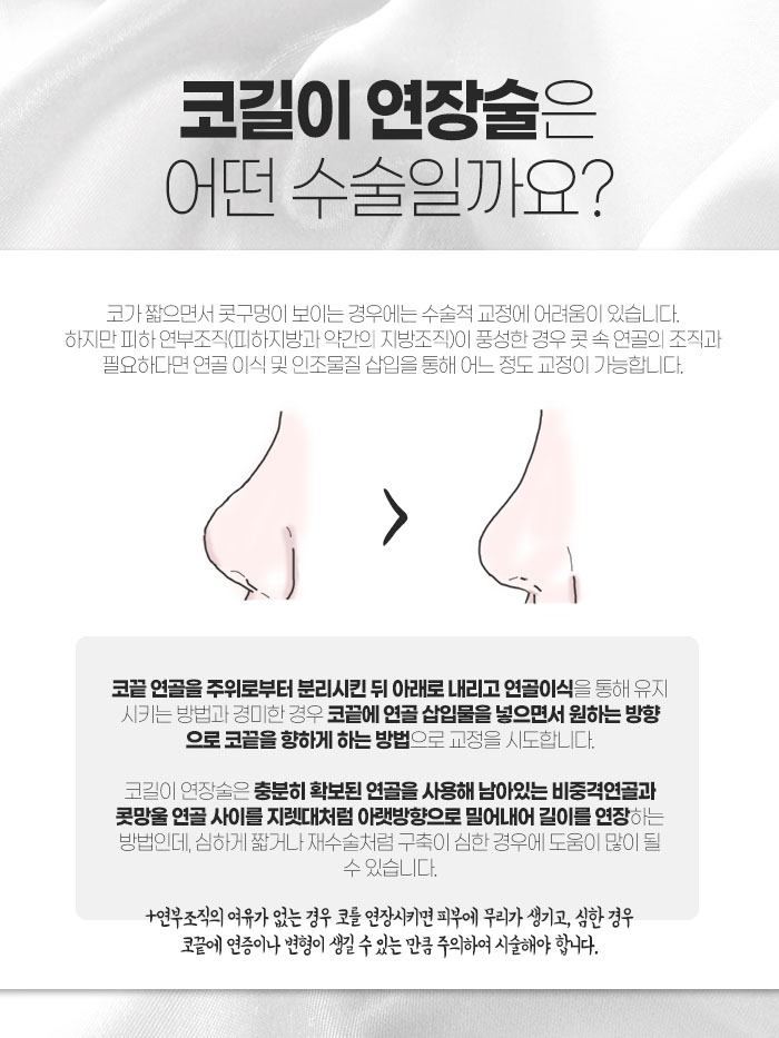 또 코끝 수술을 할 때는 반드시 자가연골을 사용하도록 해야 합니다. 그리고 예전에 받은 코 수술로 인해 구형구축 등의 부작용이 발생하게 되면서 코가 짧아지신 분들이 많습니다. 이런 경우 코길이 연장술에 대해 알아보게 되는데요.