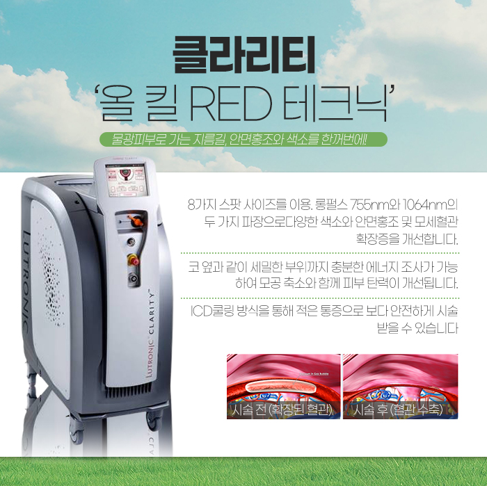 이러한 클라리티 레이저에 대해 자세히 말해보자면 8가지 스팟사이즈를 이용하고 있으며, 롱펄스 755nm와 1064nm의 두 가지 파장으로 여러 색소와 안면홍조, 모세혈관 확장증을 개선하는데 도움을 주는 기기랍니다.