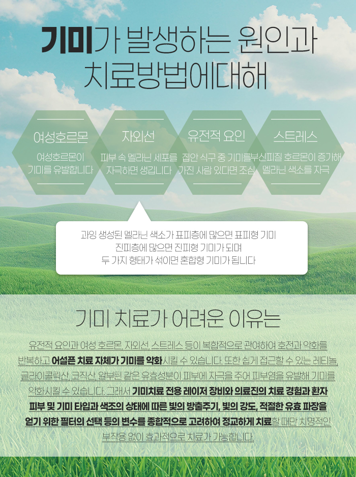 우선 용인색소치료 기미 잡티는 유전적인 요인과 여성호르몬, 자외선, 스트레스 등이 복합적으로 관여하면서 호전과 악화르 반복하게 됩니다. 그리고 이를 어설프게 치료하고자 한다면 오히려 악화시킬 수 있는데요.