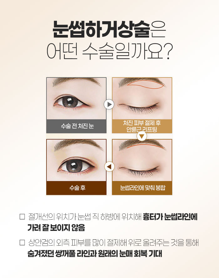 그리고 눈썹하거상술에 대해 설명해보자면 상안검 외측 피부를 많이 절제해서 위로 올려주는 것을 통해 숨겨져 있던 쌍거풀 라인과 원래 눈매를 회복하는데 도움을 받을 수 있는 수술입니다. 절개선의 위치가 눈썹 직하방에 위치하고 있어서 흉터가 눈썹 라인에 가려져 잘 보이지 않습니다.