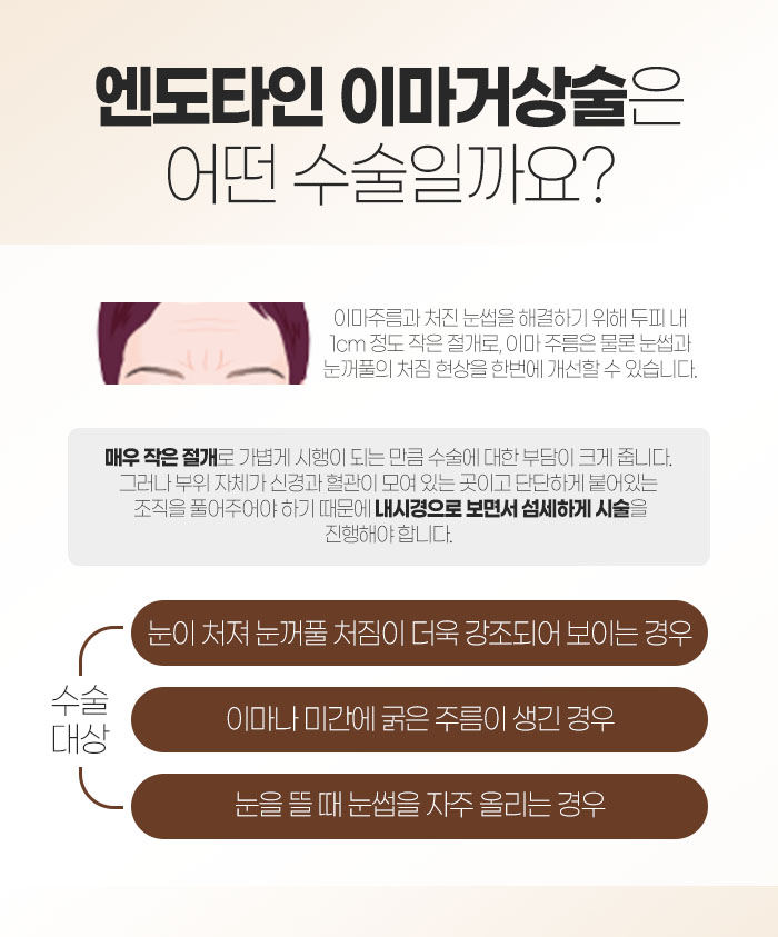 또 엔도타인 이마거상술은 이마 주름과 처진 눈썹을 개선하는데 도움을 주기 위해 두피 내 1cm 정도로 작게 절개하여 이마 주름과 눈썹, 눈꺼풀이 처진 것을 한번에 개선하는데 도움을 주는 수술을 말합니다.