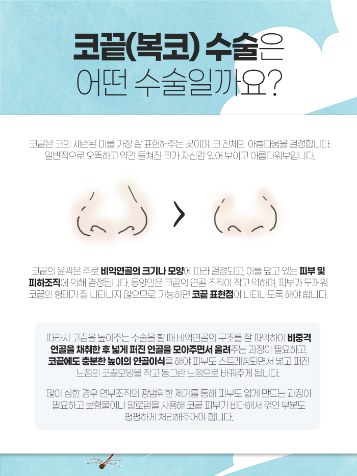 이는 코끝 수술에도 해당되는 사항인데요. 코끝 수술의 경우에도 자가조직을 이용해 콧망울의 연골의 지지 구조를 단단히 해야 합니다. 그렇지 않을 경우 콧구멍이 눌려서 찌그러지거나 짝짝이가 될 수 있어서인데요. 또 코끝 높이에 비해 콧구멍이 작고 퍼진 모양이 되기도 쉽습니다.