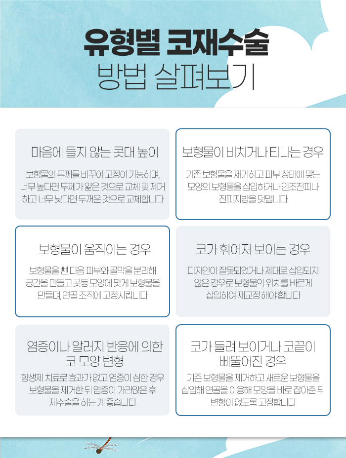 덧붙여 코가 휘어져서 재수술을 받고자 휜코수술후기에 대해 알아보시는 분들 외에도 콧대의 높이가 마음에 들지 않아서, 보형물이 비치거나 티가 나서, 보형물이 움직여서, 염증이나 알러지 반응에 의해 코 모양이 변형돼서, 코가 들려 보이거나 코끝이 삐뚤어져서 알아보시는 경우도 적지 않답니다.