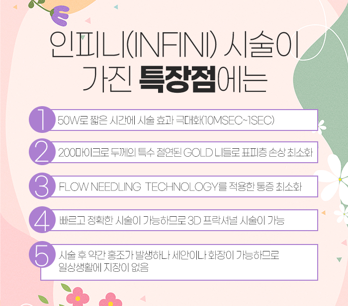 이러한 인피니에 대해 좀 더 자세히 말해보자면 50W로 짧은 시간에 시술 효과를 극대화시킬 수 있고, 200크로마이크로 두께의 특수 절연된 GOLD 니들을 사용하고 있어서 표피층이 손상되는 것을 최소화시킬 수 있습니다.