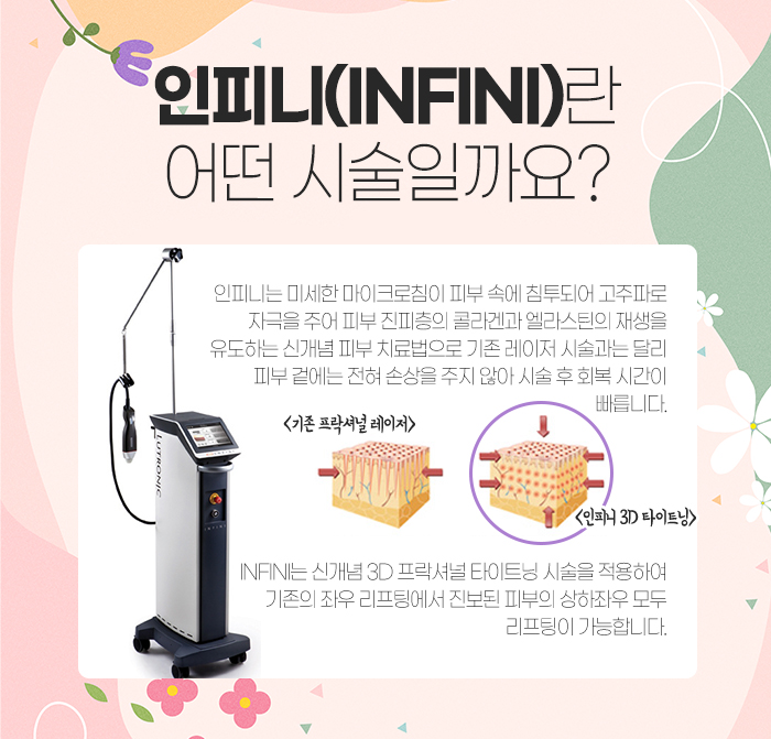 그래서 인피니에 대해 설명해보자면 미세한 마이크로침이 피부 속에 침투하게 되면서 고주파로 자국을 주어 피부의 진피층의 콜라겐과 엘라스틴의 재생을 유도하는 방법입니다. 기존의 레이저 시술과 다르게 피부 겉에 전혀 손상을 주지 않는데요. 그래서 시술을 받고 난 후 회복 시간이 빠르답니다.