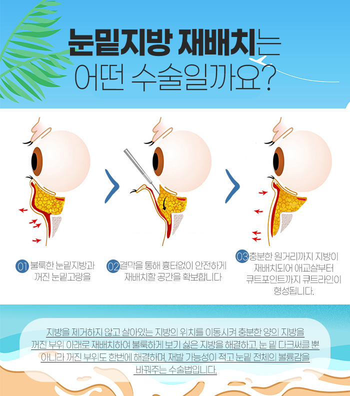 여기서 눈밑지방 재배치에 대해 소개하자면 눈밑지방을 제거하지 않고 살아있는 지방의 위치로 이동시켜서 충분한 양의 지방을 꺼진 부위 아래로 재배치하여 불룩하게 보기 싫은 지방을 개선하는데 도움을 주는 수술입니다. 눈밑 다크써클 외에도 꺼진 부위도 한 번에 개선하는데 도움을 줄 수 있는데요.
