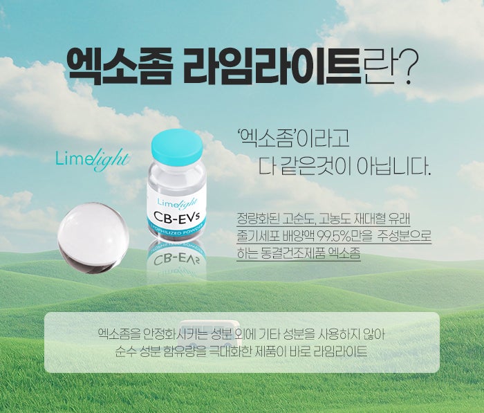 그래서 엑소좀을 통해 도움을 받고자 하시는 경우가 많은데, 이러한 엑소좀도 종류가 다양하답니다. 그리고 그중에서도 엑소좀 라임라이트를 찾으시는 경우가 많은데요. 그 이유는 정량화된 고순도, 고농도 제대혈 유래 줄기세포 배양의 99.5%만을 주성분으로 하고 있기 때문입니다. 엑소좀을 안정화시키는 성분 외에 기타 성분을 사용하지 않아서 순수 성분 함유량을 극대화시켰다고 말씀드릴 수 있습니다. 그래서 보다 좋은 효과를 기대하실 수 있습니다.
