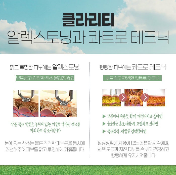 이러한 클라리티 레이저는 알렉스 토닝과 콰트로 테크닉이 있습니다. 알렉스 토닝은 분당피부관리 색소 치료를 돕는데요. 이는 부드럽고 안전하게 색소 블리칭 효과가 있기 때문입니다. 작은 색소 병변도 놓치지 않는 기술로 멜라닌 색소를 파괴하고 감소시키는데 도움을 줍니다. 눈에 띄는 색소와 칙칙한 피부톤을 동시에 개선하는데 도움을 주기 때문에 피부를 맑고 투명하게 가꾸는데 도움받으실 수 있습니다.
