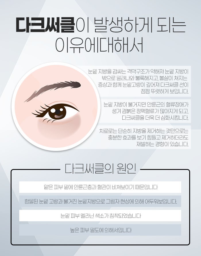 또 눈밑지방이 불거지게 되면 안륜근에 혈류장애가 생기면서 검붉은 정맥혈류가 많아지게 되고, 다크써클이 더욱 심해지게 되는데요. 이런 경우 단순히 지방을 제거하는 것만으로는 충분히 효과를 보기 힘듭니다. 또 제거를 했다고 하더라도 다시 재발하는 경향이 있답니다.