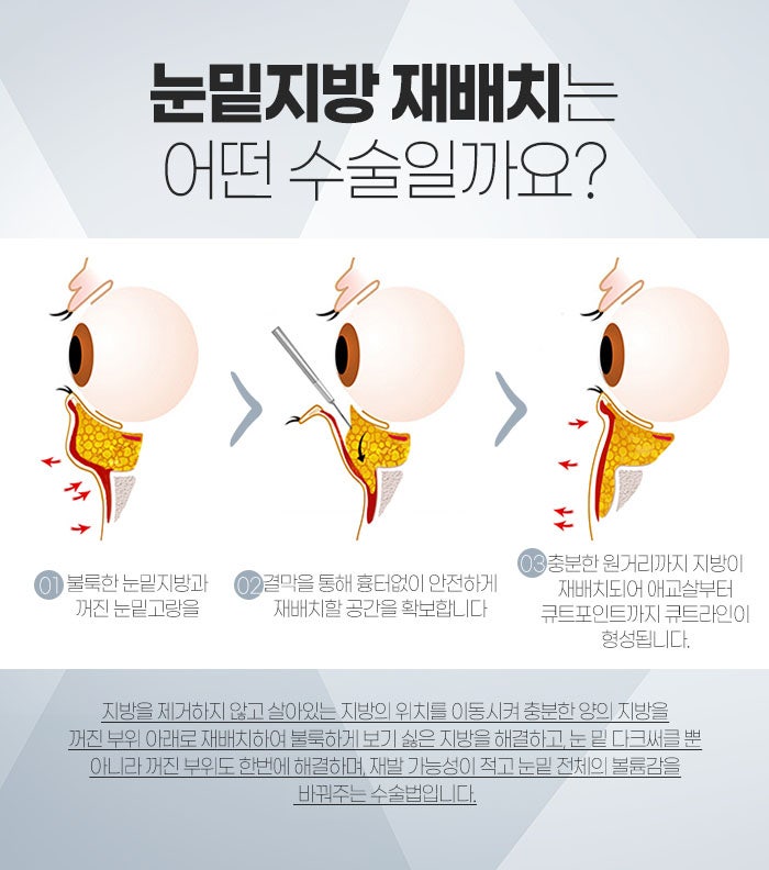 그래서 눈밑지방재배치후기에 대해 알아보게 되는 것인데요. 지방을 제거하지 않고 살아있는 지방의 위치를 이동시켜서 충분한 양의 지방을 꺼진 부위 아래로 재배치하여 불룩하게 보기 싫은 지방을 개선하는데 도움을 받을 수 있기 때문입니다. 특히 눈밑 다크써클 외에도 꺼진 부위도 한 번에 개선하는데 도움을 받아보실 수 있는데요. 또 재발 가능성이 적으며 눈밑 전체의 볼륨감을 바꾸는데 도움을 받아보실 수 있습니다.