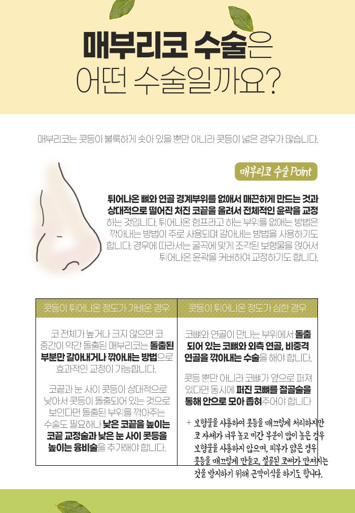 또 이렇게 여자매부리코 수술 등에 대해서 알아볼 때 보형물 없이 코수술을 진행하기 위해 문의주시는 경우가 많습니다. 이런 경우 정말 보형물 없이 코수술이 진행한 경우인지 아니면 불가피하게 보형물을 사용하지 않고서는 코가 제대로 개선되지 않는 상태인지 등에 대해 제대로 진단받을 수 있는 곳을 찾도록 해야 합니다.
