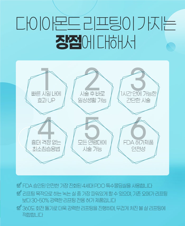 또 빠른 시일 내에 효과가 나타나고 시술을 받고 나서 바로 일상생활 생활을 하는 것이 가능한데요. 1시간 안에 받는 것이 가능한 간단한 시술이며, 모든 연령대가 받을 수 있습니다. 그리고 FDA에서 승인된 4세대 PDO 특수 몰딩실을 사용하고 있는데요. 리프팅 목적으로 하는 녹는 실 중에서 가장 파워 있게 리프팅을 할 수 있고, 기존의 오메가 리프팅보다 30~50% 강력한 리프팅 전용 허가 제품이랍니다. 360도 회전 돌기로 보다 강력하게 리프팅이 진행되기 때문에 무겁게 처진 볼살을 리프팅하기에도 적합하답니다.