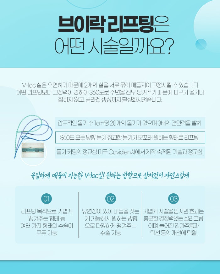 다음으로 분당실리프팅 브이락리프팅은 유연한 브이락 실을 사용하고 있습니다. 두 개의 실을 서로 묶어 매듭지어 고정시킬 수 있는데요. 어떤 리프팅보다 고정력이 강하고 360도로 주변을 전부 당겨주는 만큼 피부가 울거나 잡히지 않으며 콜라겐 생성까지 활성화시켜줄 수 있습니다.
