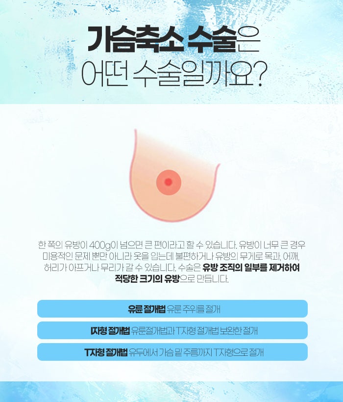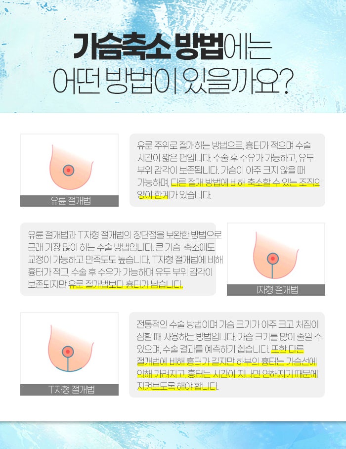 그리고 T자형 절개법은 전통적인 수술 방법인데요. 가슴의 크기가 아주 크며 처짐이 심할 때 사용하게 되는 방법이랍니다. 가슴의 크기를 많이 줄일 수 있는데다 수술 결과도 예측하기 쉬운데요. 하지만 다른 절개법과 비교했을 때 흉터가 긴 편입니다. 하부의 흉터의 경우 가슴 선에 의해 가려지는데, 이러한 흉터는 시간이 지나면서 연해지기 때문에 지켜보도록 해야 합니다.