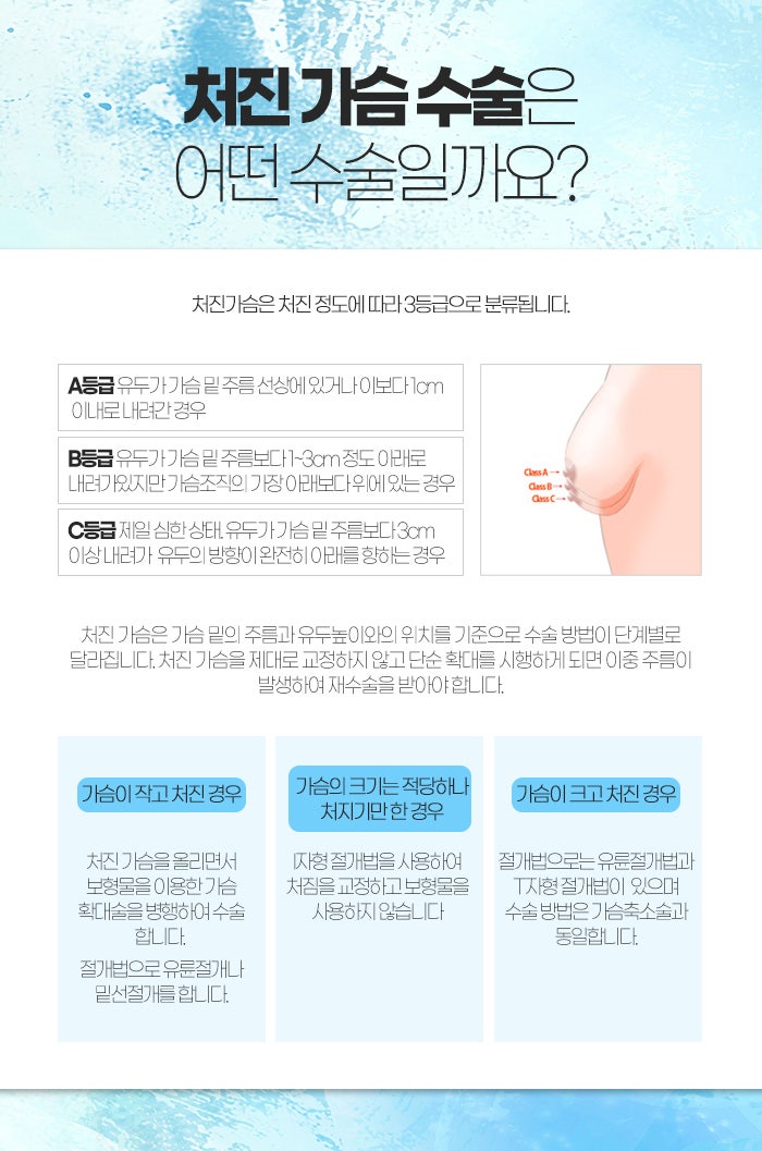A등급은 유두가 가슴 밑 주름 선상에 있거나 보다 1cm 이내로 내려간 경우를 말합니다. B등급은 유두가 가슴 밑 주름보다 1~3cm 정도 아래로 내려가있으나 가슴조직의 가장 아래보다 위에 있는 경우를 말합니다. 또 C등급은 제일 심한 상태인데요. 유두가 가슴 밑 주름보다 3cm 이상 내려가서 유두의 방향이 완전히 아래를 향하는 경우를 말합니다.