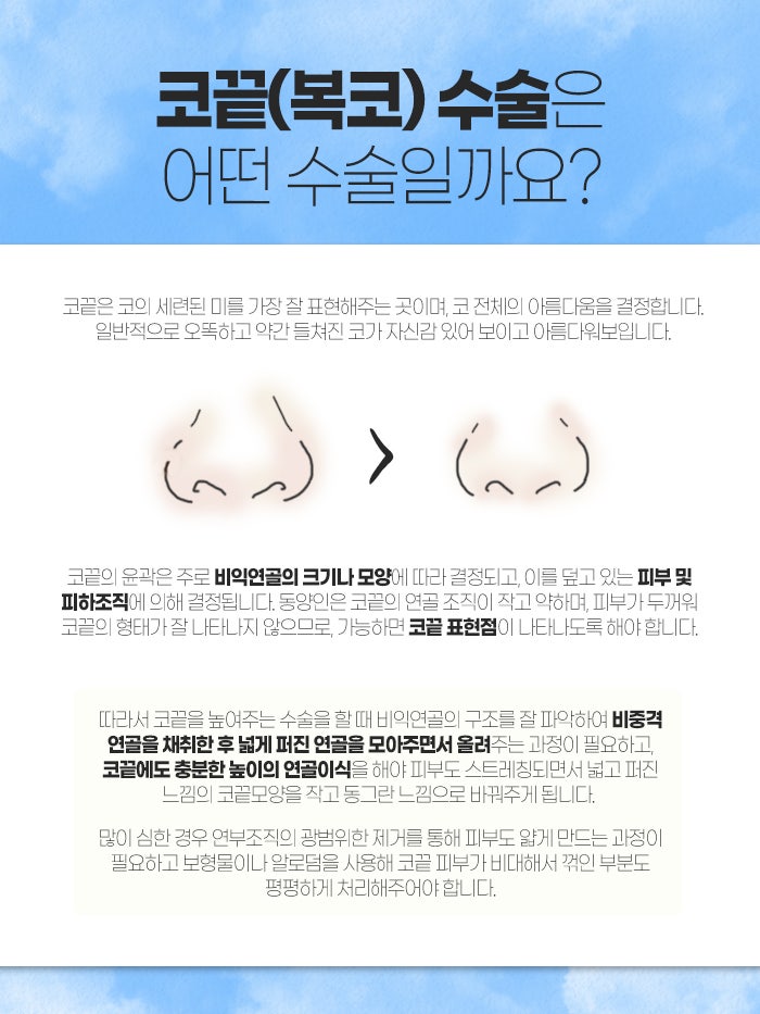 그리고 매부리코로 인해 수술하는데 보형물을 넣는 경우는 콧대 전체가 낮은 경우인데요. 이런 경우에는 절골술로 마무리를 하지 않으며 잘 깎여진 보형물로 콧대 선을 마무리하게 된답니다. 이때 돌출된 부위를 깎아주는 수술을 진행하면서 콧등을 높이고 낮은 코끝을 올리는 코끝교정술을 같이 진행하도록 해야 합니다.