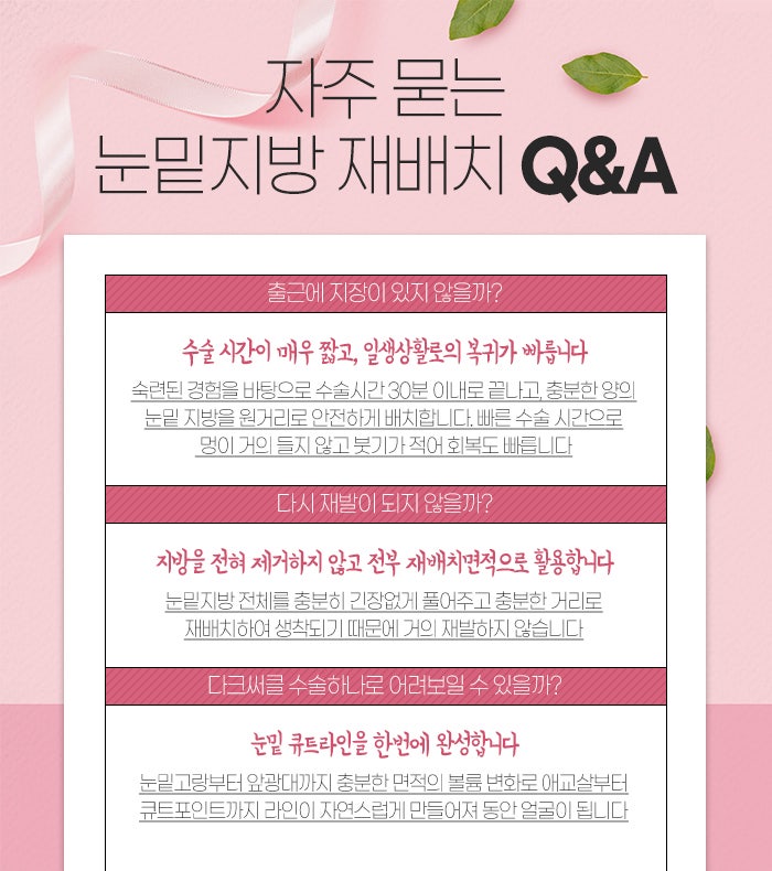 하지만 비용 문제로 최대한 부담이 덜한 곳을 찾다가 숙련도가 부족한 곳에서 수술을 받게 되는 경우가 적지 않은데요. 이런 경우 수술 시간이 오래 걸리면서 눈밑지방재배치후기 통증도 클 수 있고, 재배치가 충분히 이루어지지 않을 수 있습니다. 실제로 이러한 문제로 눈밑지방재배치후기 통증 등에 대해 문의하시는 경우가 많고, 또 재수술을 받기 위해 찾아주시는 경우가 적지 않답니다.