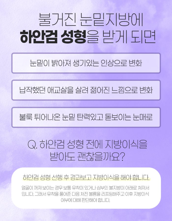 덧붙여 수술 후 애교살이 부족할 것 같아 지방이식 수술에 대해서도 알아보시는 분들이 많습니다. 그래서 이에 대해 말해보자면 하안검수술 후 지방이식을 고려하도록 해야 하는데요. 하안검수술이 유착된 조직을 풀어주어야 하는 수술인 만큼 지방이식을 먼저 받게 되면 유착된 조직을 풀어주기 어렵습니다. 그래서 좋은 결과를 기대하기 힘들기 때문입니다.